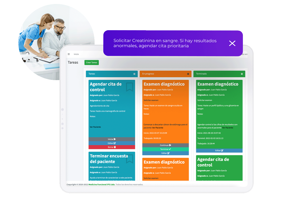 Nuestro equipo médico investiga los riesgos en salud de cada persona. Se apoya en un algoritmo que sospecha el riesgo de más de 500 segmentos de patologías distintas y genera preguntas para calcular las probabilidades del riesgo. Los riesgos altos llevan a sugerir exámenes paraclínicos para su confirmación o descarte.